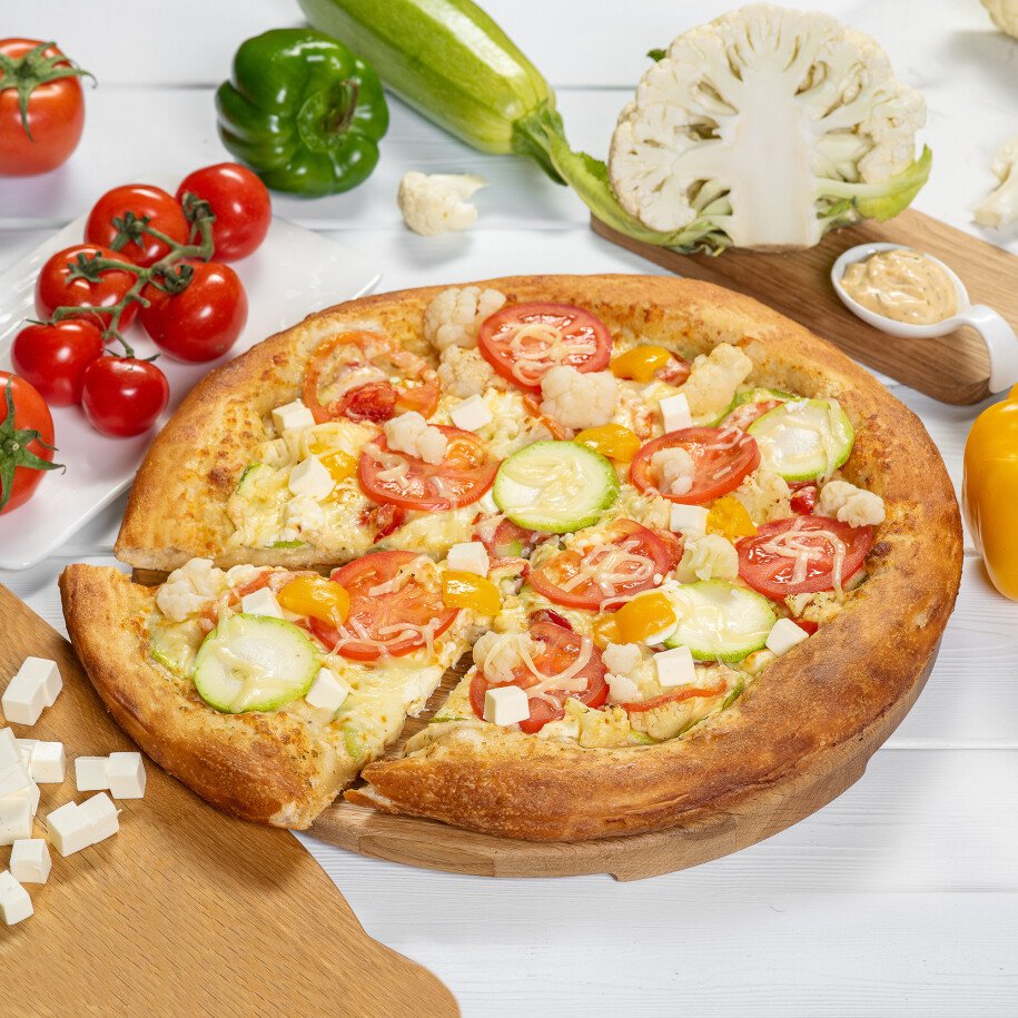тесто дрожжевое, сыр моцарелла, цукини, капуста цветная, помидоры свежие, сыр фетакса, перец болгарский, соус фирменный «Ранч»