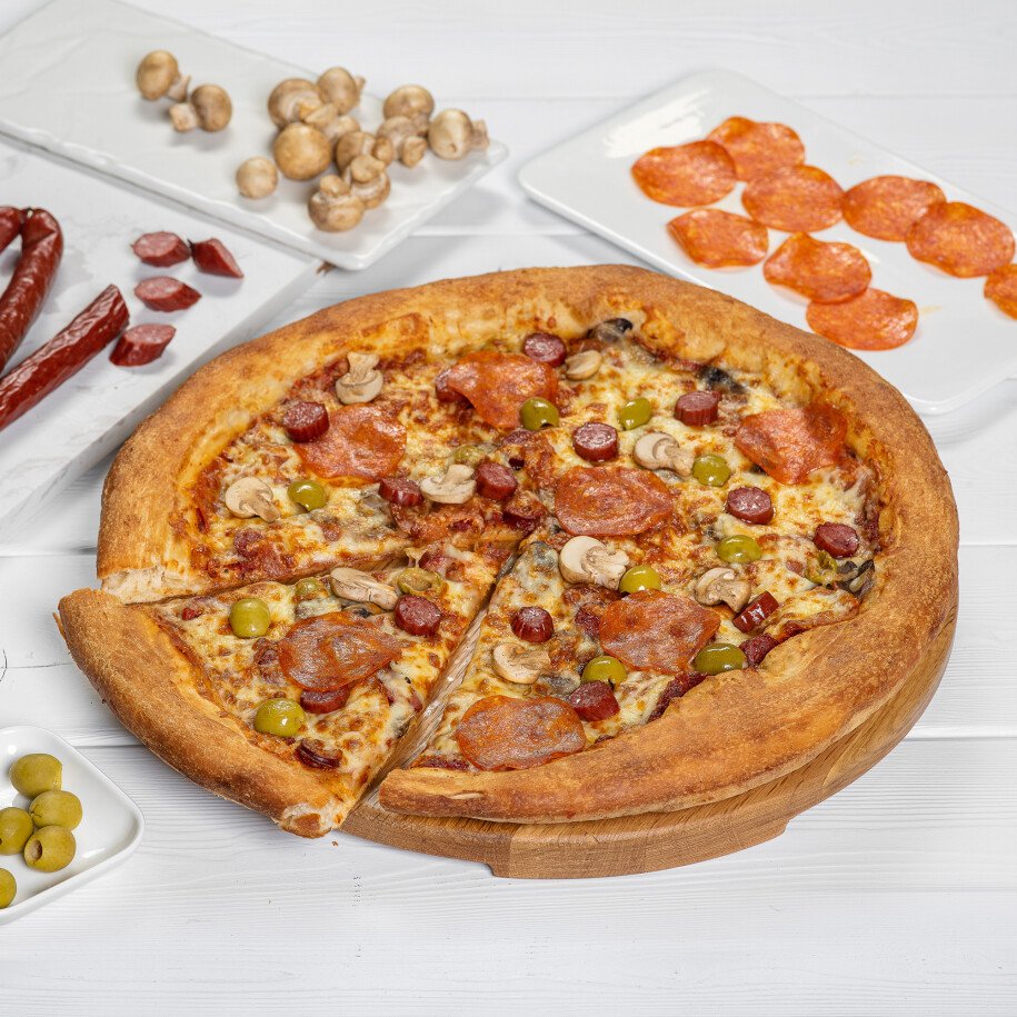тесто дрожжевое, охотничьи колбаски, сыр моцарелла, колбаса полукопчёная, шампиньоны, соус красный фирменный, оливки, лук репчатый