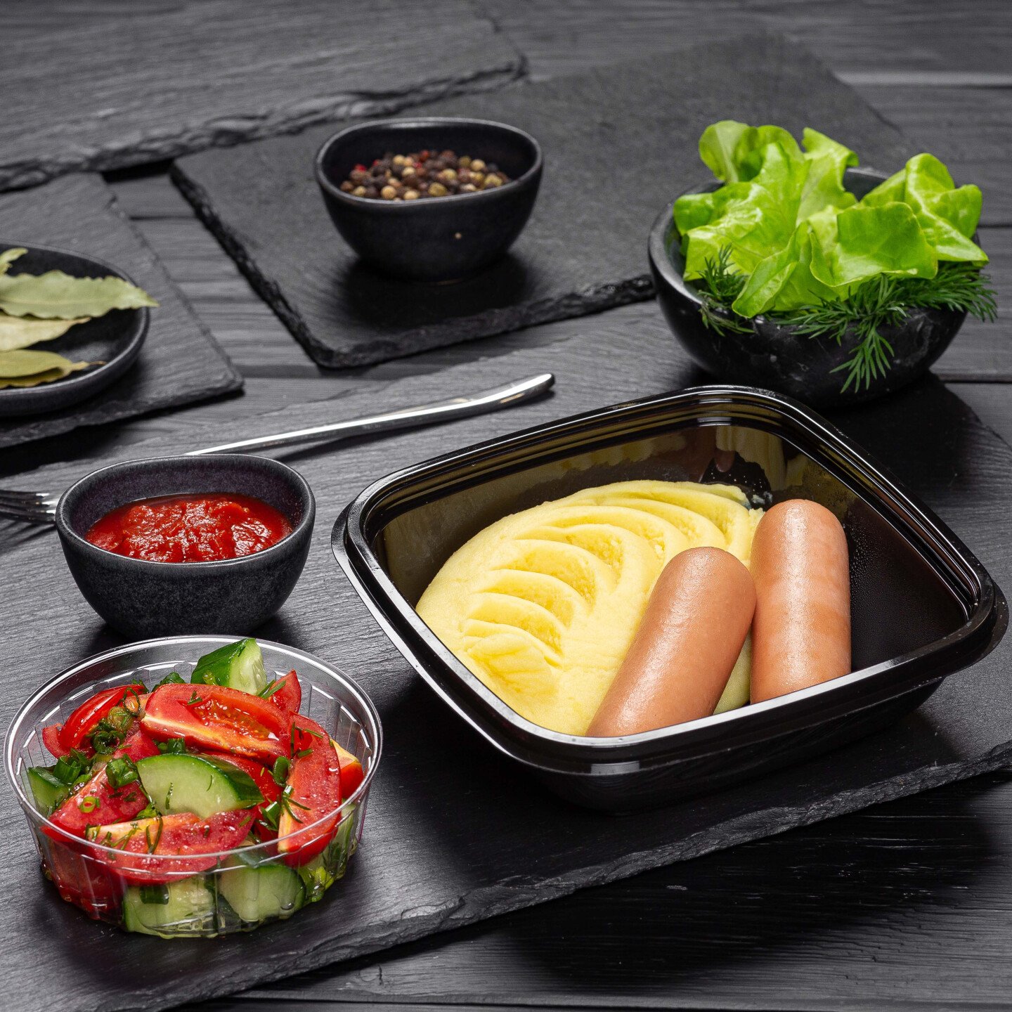 сосиски отварные, картофельное пюре (картофель свеж., молоко цельное, сливочное масло, соль), закуска из свежих овощей (огурец свежий, помидоры черри, масло растительное, зелень), соус красный (томат-паста, помидоры свеж., масло растительное, сахар, соль, базилик суш., орегано суш.)