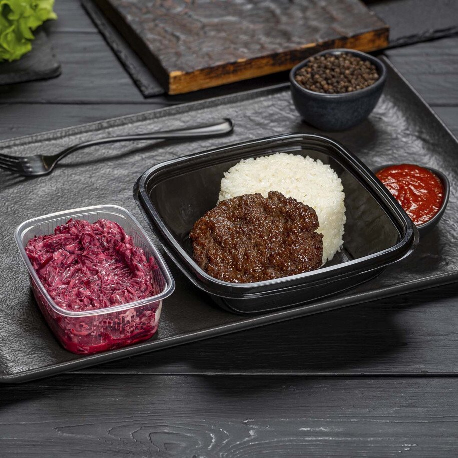 бифштекс из говядины (фарш говяжий, соль, перец, масло растительное); рис отварной (крупа рисовая, масло растительное, соль); закуска из свёклы (свёкла отварная, майонез, чеснок); соус красный фирменный (паста томатная, помидоры свежие, сахар-песок, масло растительное, помидоры черри, чеснок свежий)