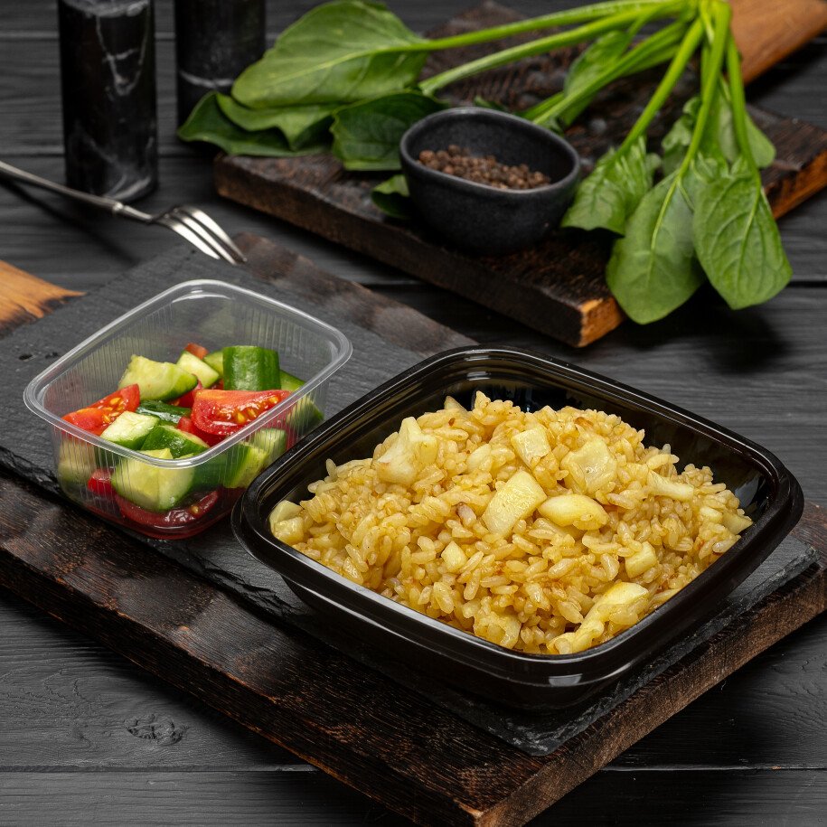 рис отварной, кальмар, соус устричный, масло сливочное, специи; закуска из свежих овощей (огурец свежий, помидор свежий, масло растительное, зелень)