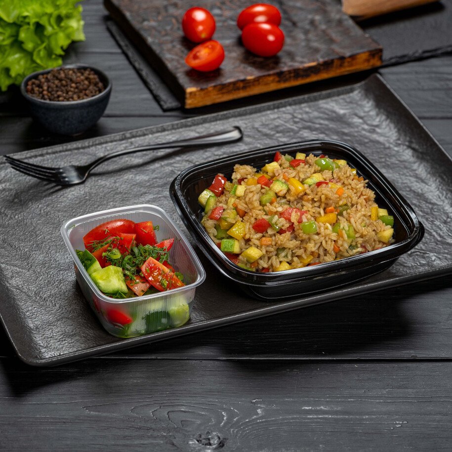рис, перец болгарский свежий, цукини свежий, лук репчатый свежий, морковь свежая, масло растительное, соевый соус, специи, закуска из свежих овощей (огурец свежий, помидор свежий, масло растительное, зелень)