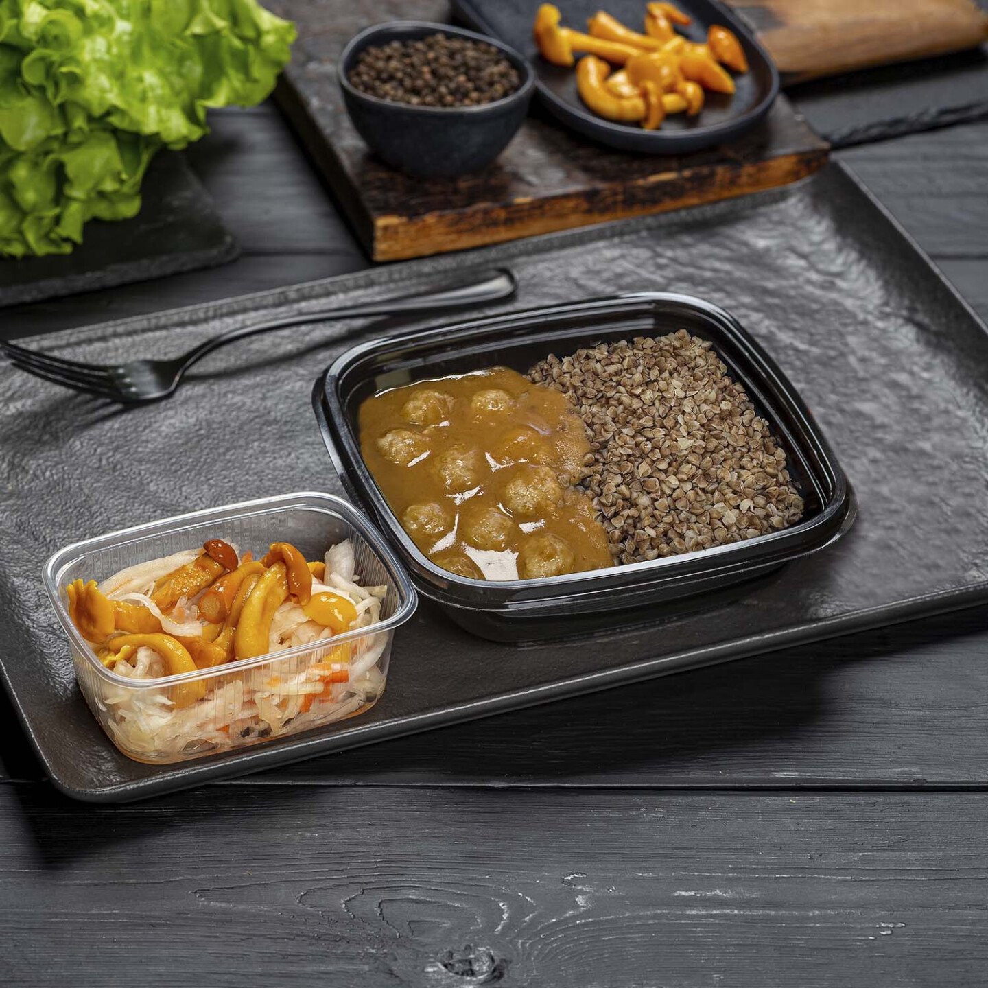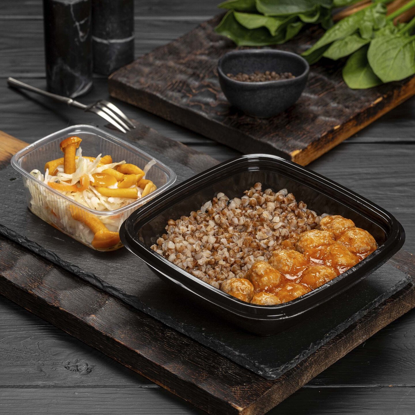 Фрикадельки мясные с гречкой и закуска из маринованой капусты с опятами