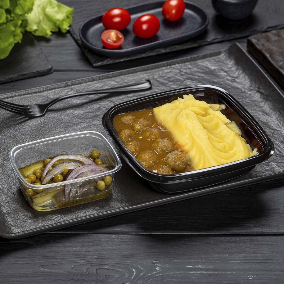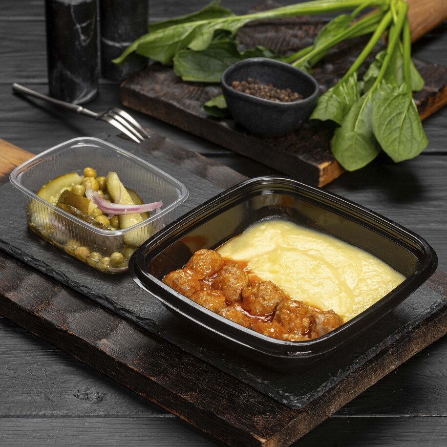 Фрикадельки мясные с картофельным пюре и закуска из консервированных огурцов
