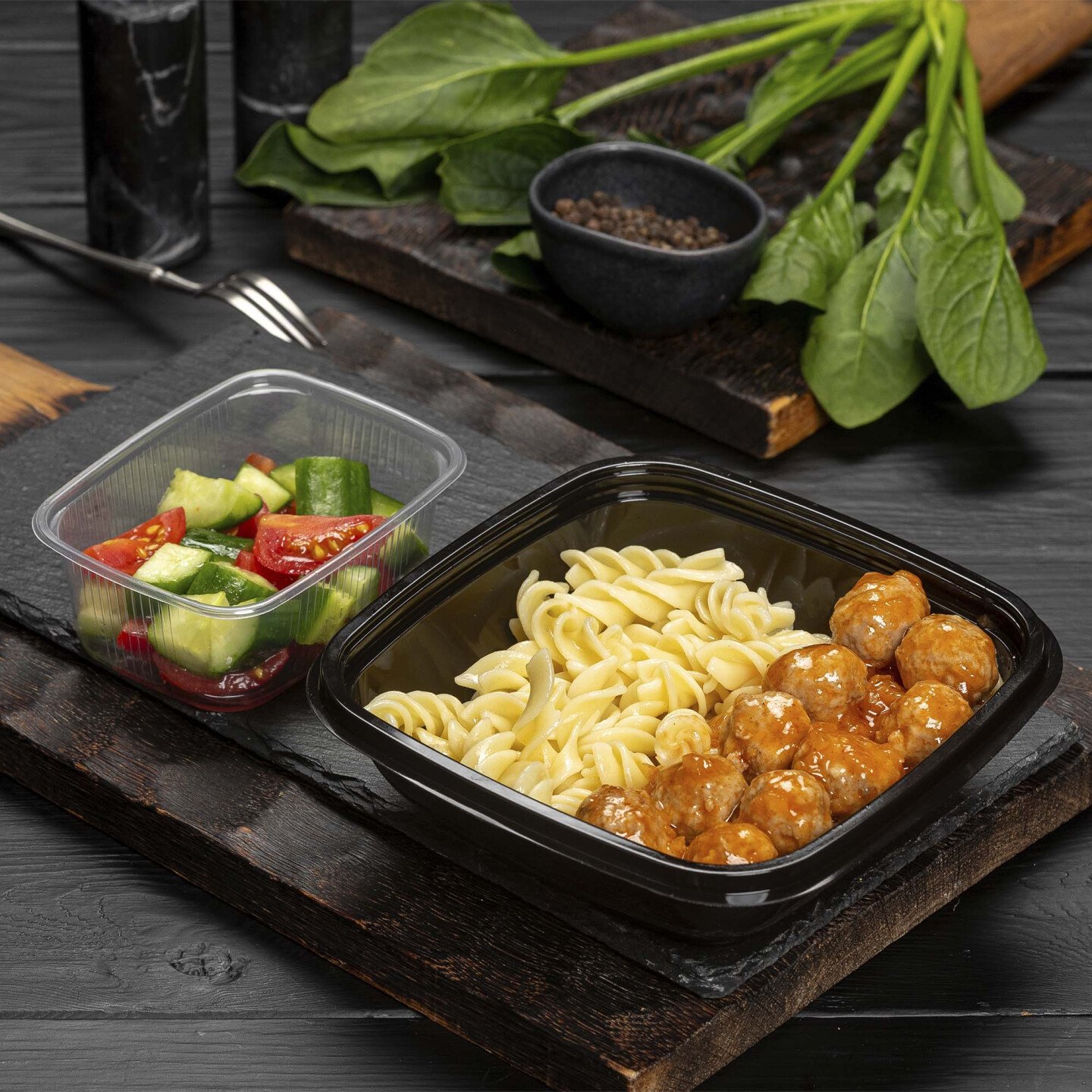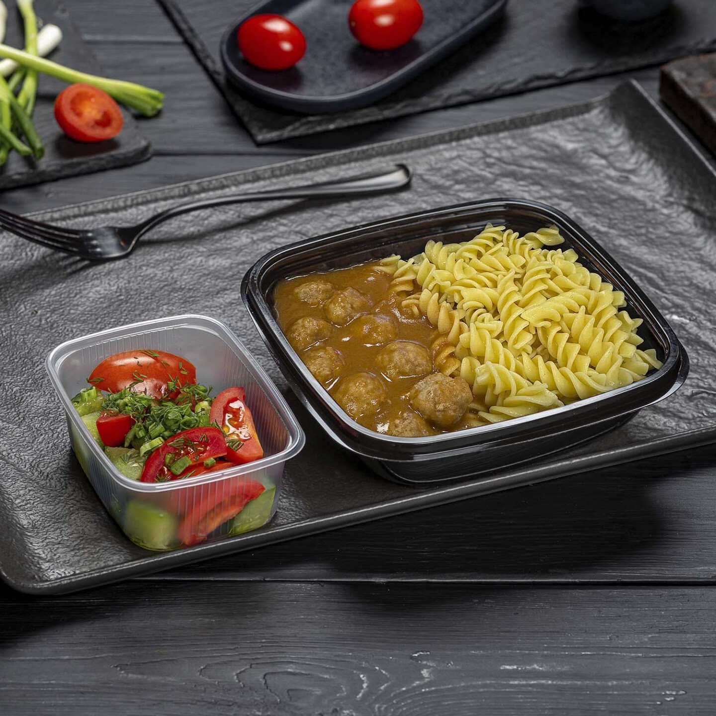 Фрикадельки мясные с макаронами и закуска из свежих овощей