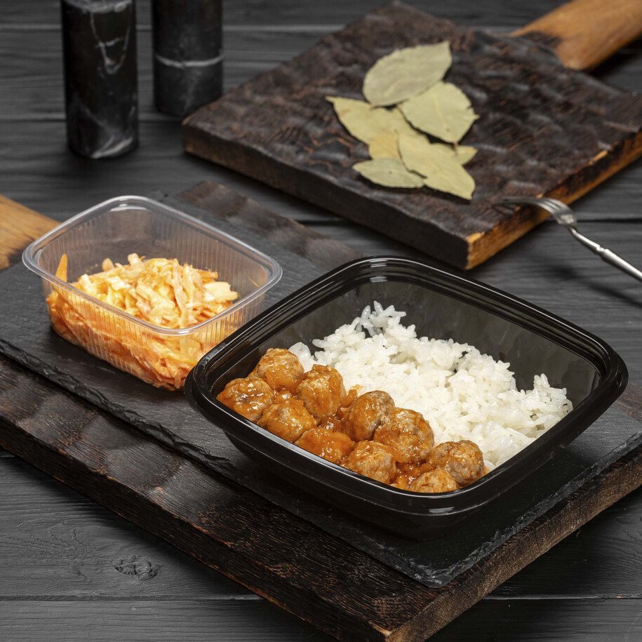 фрикадельки мясные (фарш из свинины и говядины, лук репчатый свеж., сухари панировочные, молоко сухое, соль, перец ч/м), лук репчатый свежий, масло растительное, мука пшеничная, томатная паста, перец ч/м), рис (крупа рисовая, масло растительное, соль) закуска из моркови (морковь св., сыр, майонез, чеснок)