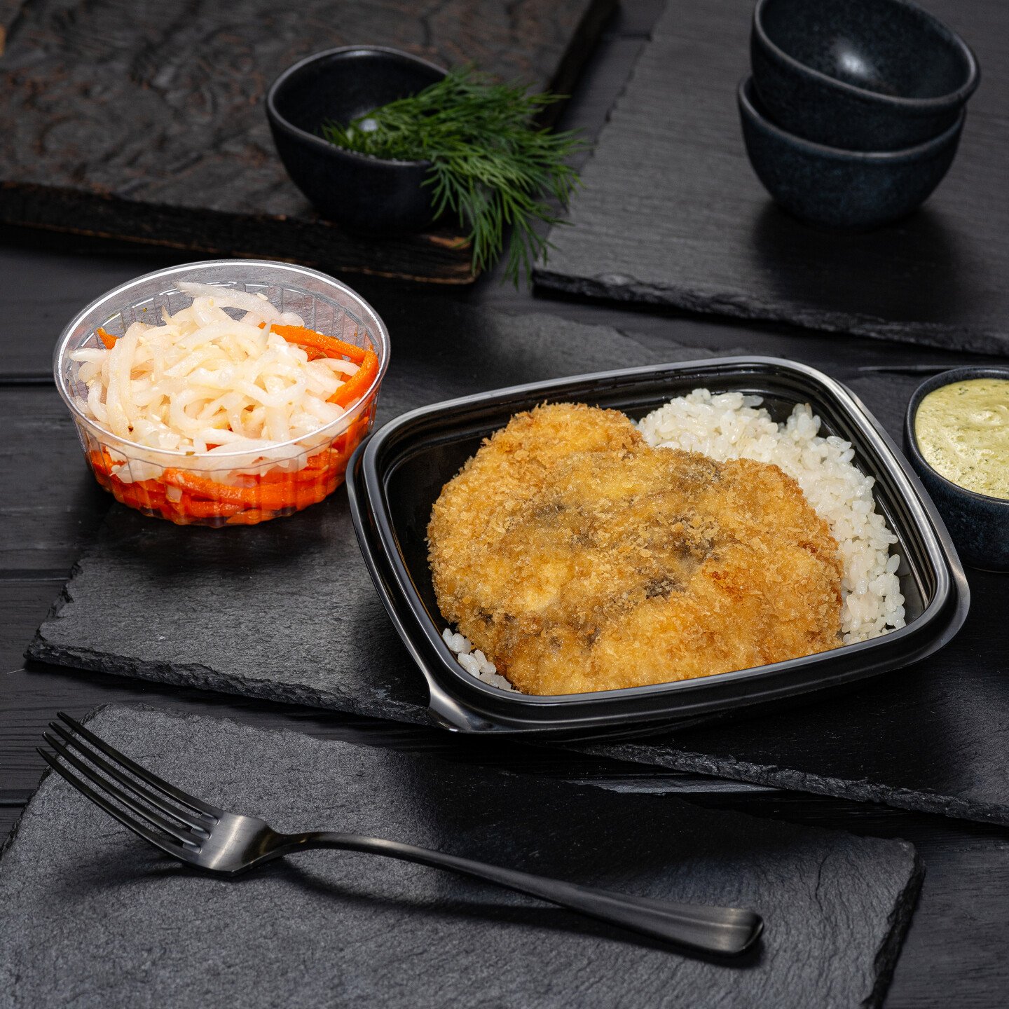 Тонкий пласт куриного филе, обжаренный в панировке, подаётся с соусом тартар, гарниром из отварного риса и салатной закуской из дайкона и морковки, приправленной ароматным чесночком.