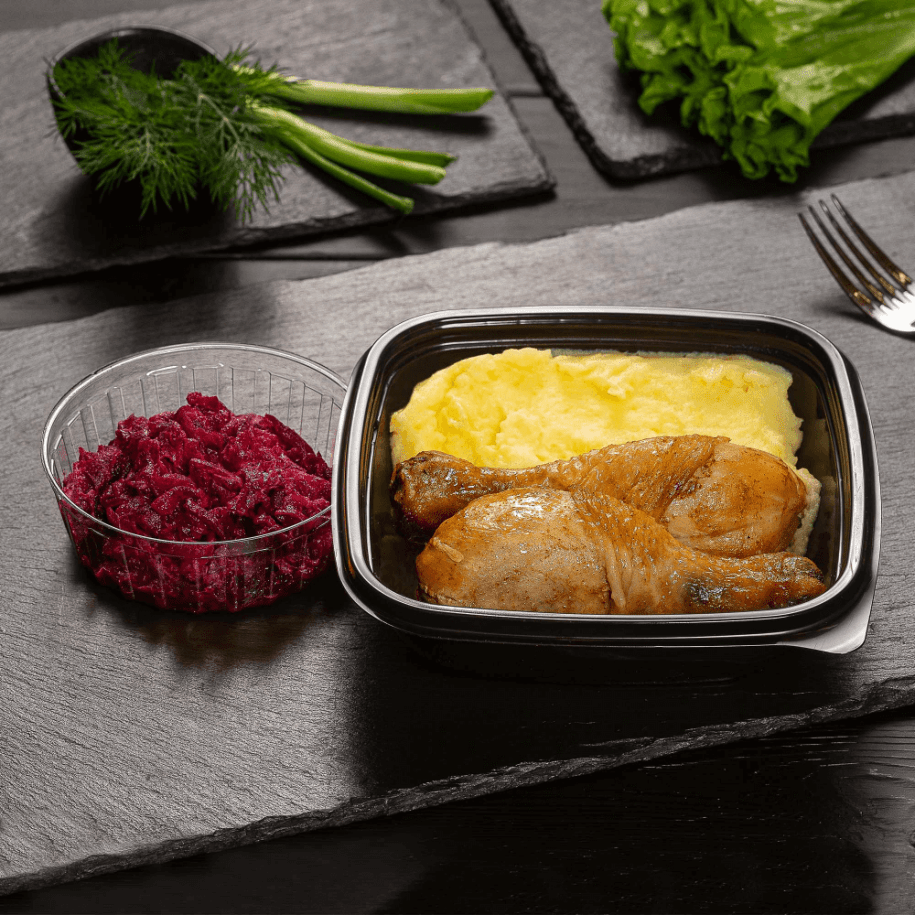 Острые куриные ножки, с гарниром из картофельного пюре и салатной закуской из свеклы с ароматным чесночком