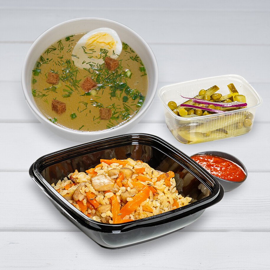 бульон (вода, бедро кур., морковь свежая, лук репчатый, соль), лук зеленый свеж., укроп свеж., сухарики (хлеб подольский), яйцо отварное (куриное яйцо), рис, бедро филе с/м, морковь свеж., лук репчатый свеж., масло растительное, приправа для плова, соль, закуска из консервированных огурцов (огурцы конс, зеленый горошек, лук красный свеж., масло растительное), соус красный фирменный (томаты свежие, томат паста, масло оливковое, соль, сахар, чеснок свежий, специи)