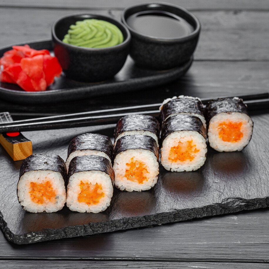 Рис отварной, гребешок, майонез, икра тобико; васаби, имбирь маринованный, соевый соус