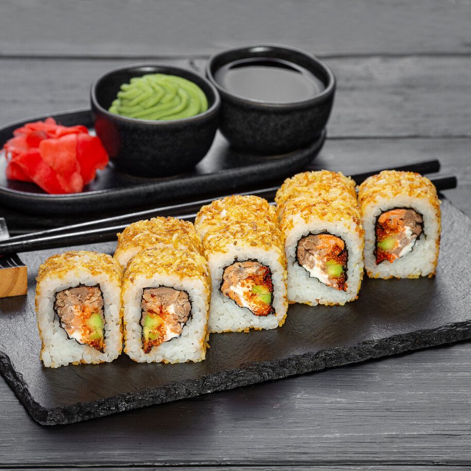 Сочные кусочки лосося и кремовое авокадо обернуты золотистой картофельной стружкой, которая добавляет приятный контраст. А текстурное изобилие этого ролла создаёт гармонию свежести и обжаренности, погружая в мир незабываемых вкусовых ощущений.