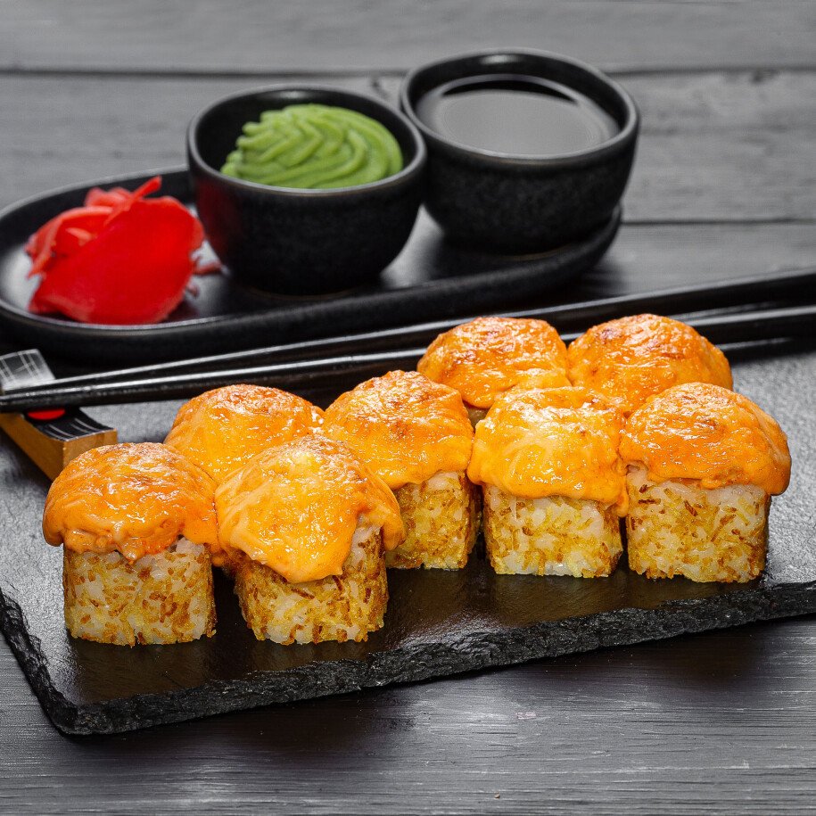 Рис отварной, огурец, японский блин, гребешок, лосось, картофельная стружка, икра тобико, спайс соус, сыр пармезан, соус запеченный; васаби, имбирь маринованный, соевый соус