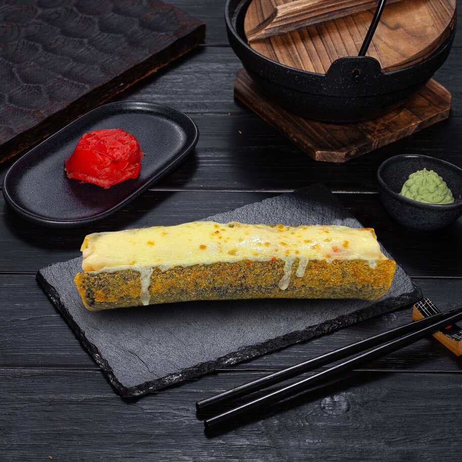 рис отварной, мясо краба, майонез, сыр сливочный, сыр моцарелла, икра тобико, яйцо, сухари панировочные, огурец свежий, водоросли нори, сухари панировочные, мука панировочная.