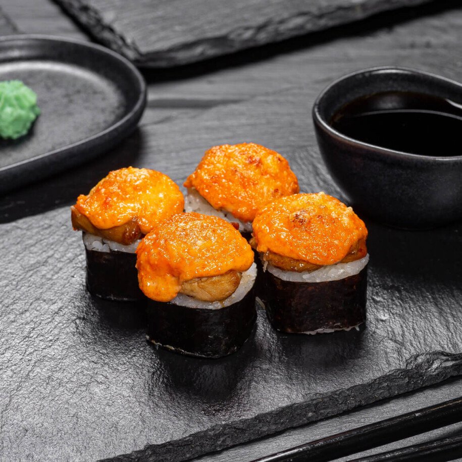 Нежные кусочки курицы, приготовленные до золотистой корочки, сочетаются с хрустящим огурцом и сладкими черри. Всё это выгладывается аппетитной шапочкой на подушку из риса, обёрнутую в нори — запекается под специальным соусом, что придаёт блюду пикантный и насыщенный вкус.
