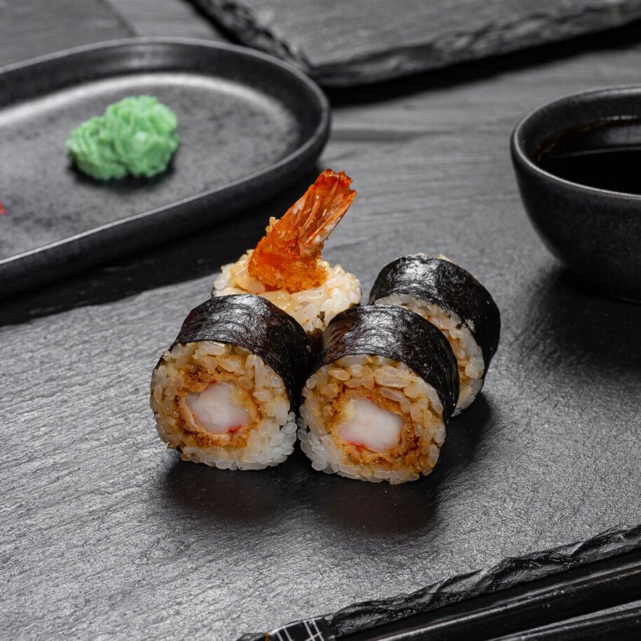 Хрустящая темпура, обволакивающая сочную креветку, сочетается с карамельным соусом унаги, создавая контраст текстур и богатый, многослойный вкус. Истинный праздник для вкусовых рецепторов.