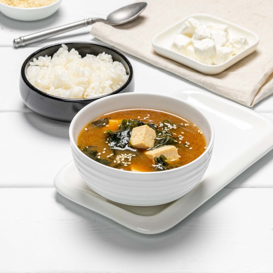 Традиционный японский суп с лёгким вкусом мисо, мягким тофу и морскими водорослями. Подаётся с порцией отварного риса для полноты удовольствия.