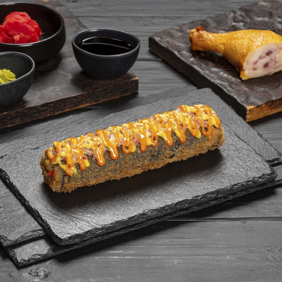 Классика японской кухни в новом исполнении. Ароматная копчёная курочка со сливочным сыром, свежим огурчиком в объятиях риса и водорослей нори в хрустящем кляре под горчичным соусом.