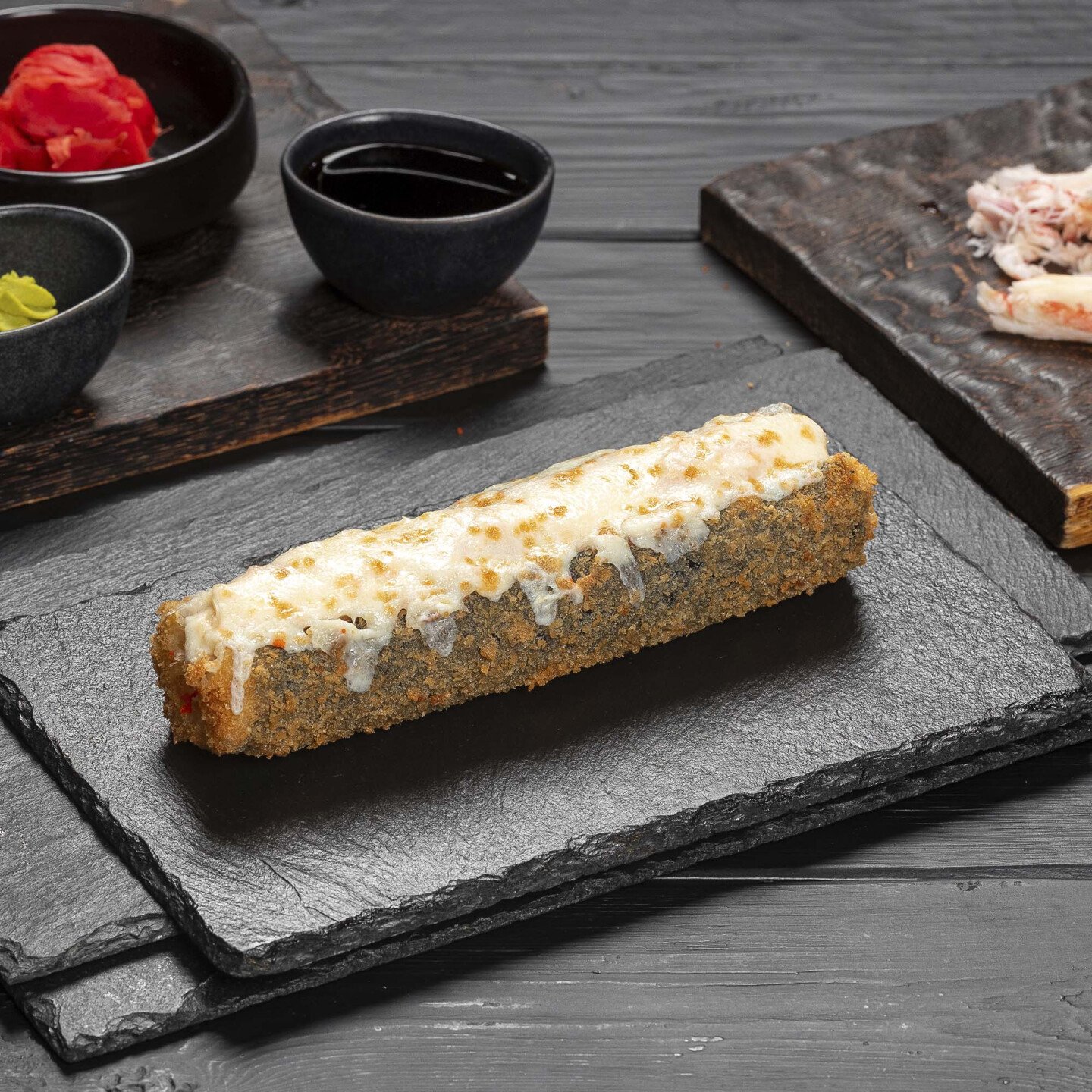 Ролл-дог с крабом — это уникальное сочетание нежного мяса краба и сливочного сыра, завернутое в рис и водоросли нори. Хрустящие панировочные сухари придают ему аппетитную текстуру, а свежий огурец и икра тобико добавляют яркие акценты во вкус. Этот ролл станет настоящим гастрономическим открытием для любителей морепродуктов.