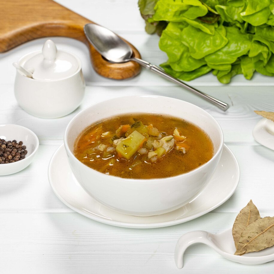 бульон куриный (куриный суповой набор, морковь свежая, лук репчатый), крупа перловая,