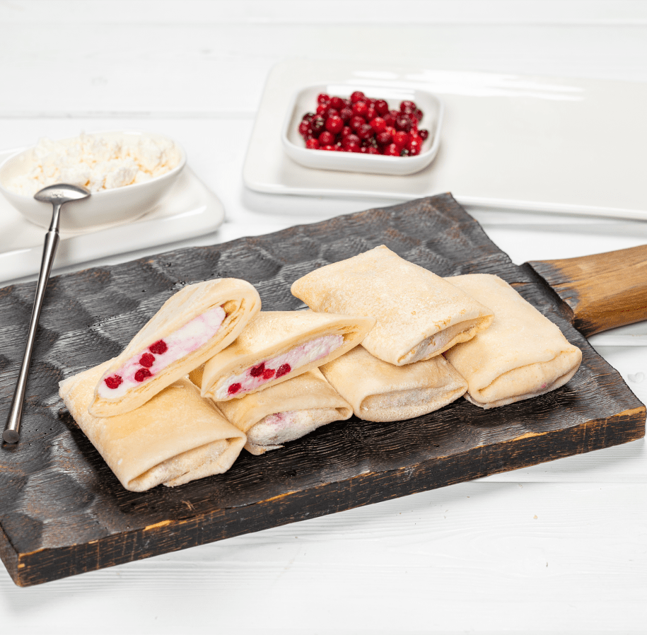 блинная оболочка п/ф (молоко, мука в/с, яйцо, сахар, соль, масло растительное), творожная масса, брусника с/м