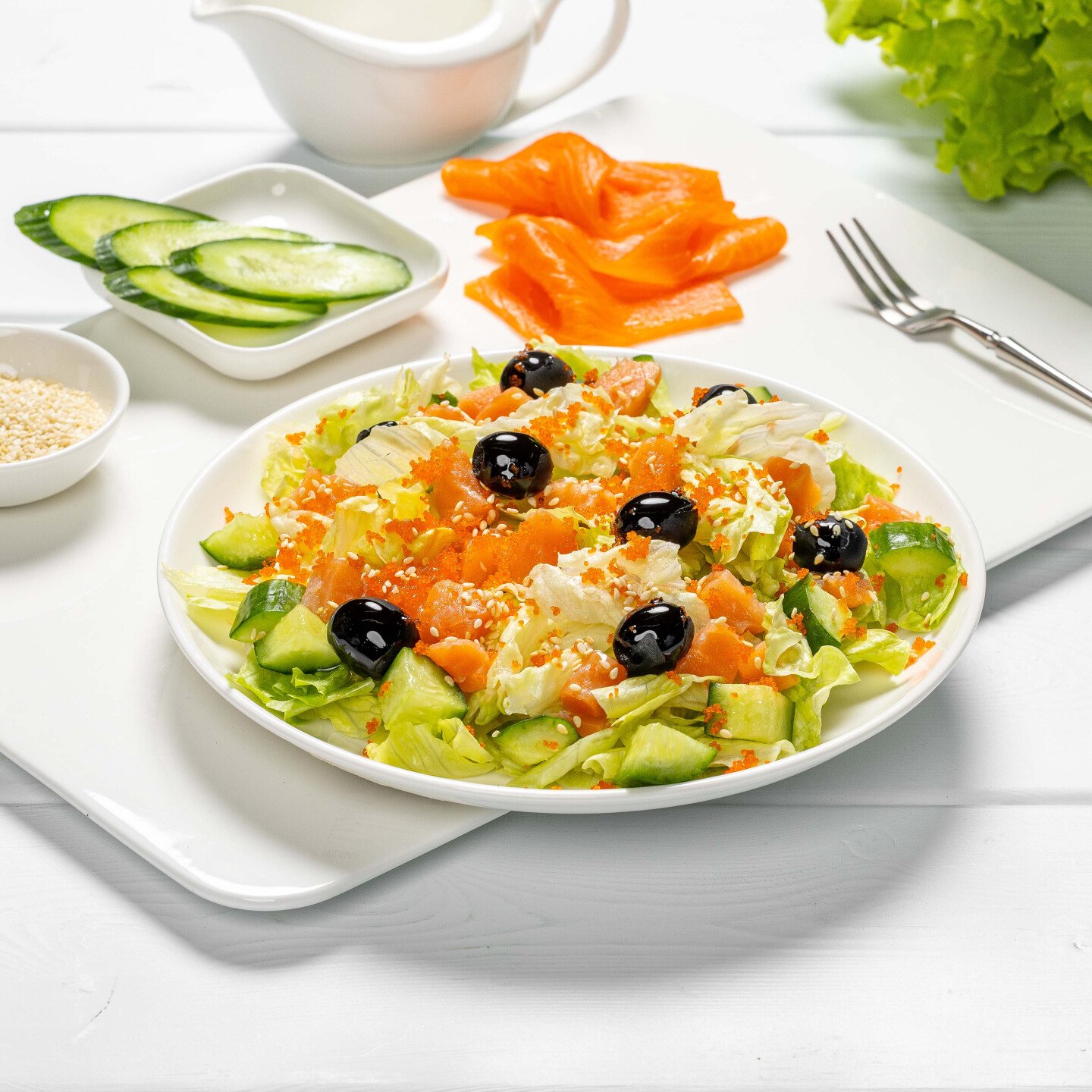 лист салата, лосось малосолёный (лосось с/м, соль, сахар, перец чёрный молотый), огурец свежий, маслины б/к, оливковое масло, уксус бальзамический, икра масаго, кунжут.