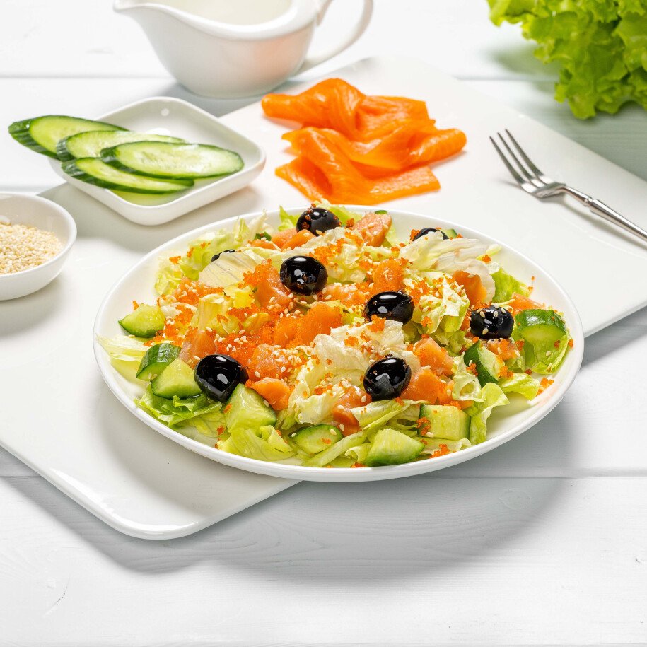 Салат с малосольной рыбой — это лёгкое и изысканное блюдо, в котором свежий лист салата гармонично сочетается с нежным малосольным лососем и хрустящим огурцом. Дополняют вкус маслины, а икра масаго и кунжут придают салату особую изюминку.