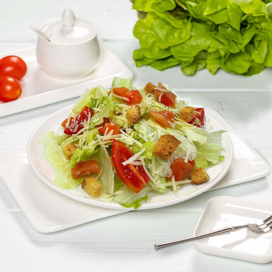 помидоры черри, лосось малосоленый (лосось, соль, сахар), лист салата, сыр твердый, сухари, соус (майонез, тунец конс., крем бальзамик)