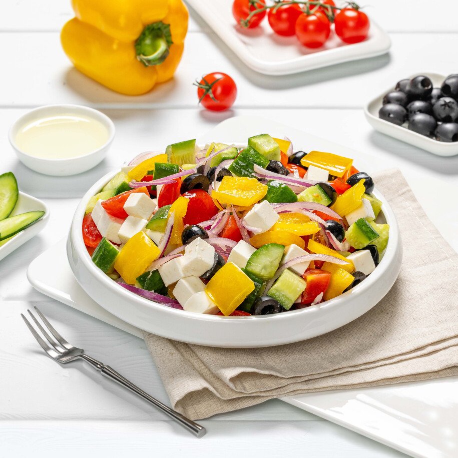Классический овощной салат с сыром фетакса и маслинами