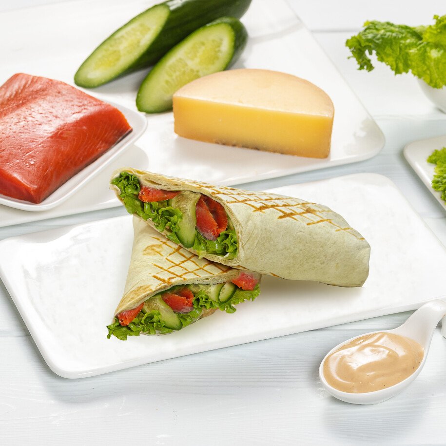 лепешка пшеничная, лосось м/с (лосось с/м, соль, сахар, перец ч/м), лист салата, сыр сливочный, огурец свежий.