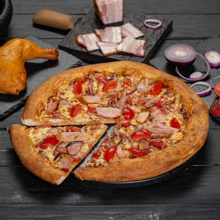 тесто дрожжевое, окорочок копчённый, соус Барбекю, лук красный, помидоры черри, свиная грудинка, сыр моцарелла