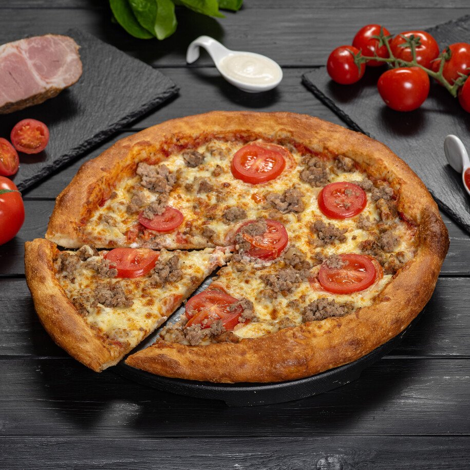 тесто дрожжевое, сыр Моцарелла, фарш мясной (свинина, говядина, лук репчатый), соус фирменный томатный, помидоры, майонез