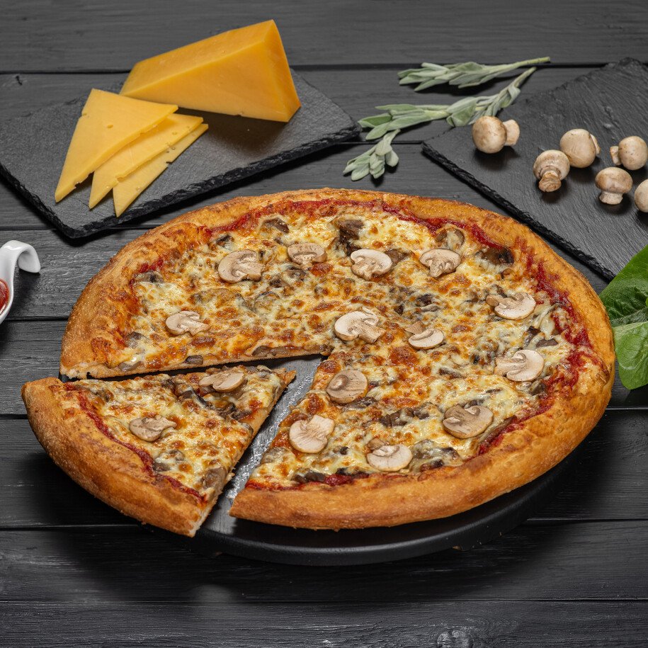 тесто дрожжевое, сыр моцарелла, жаренные с луком шампиньоны, соус красный фирменный