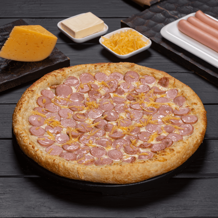 Вкус знакомый каждому ребенку. Детская пицца с нежными сосисками, приготовленными до золотистой корочки в сочетании со сливочным вкусом горячего сыра на пышном тесте. Еда, которая не только утоляет голод, но и приносит удовольствие каждому, кто ее попробует.