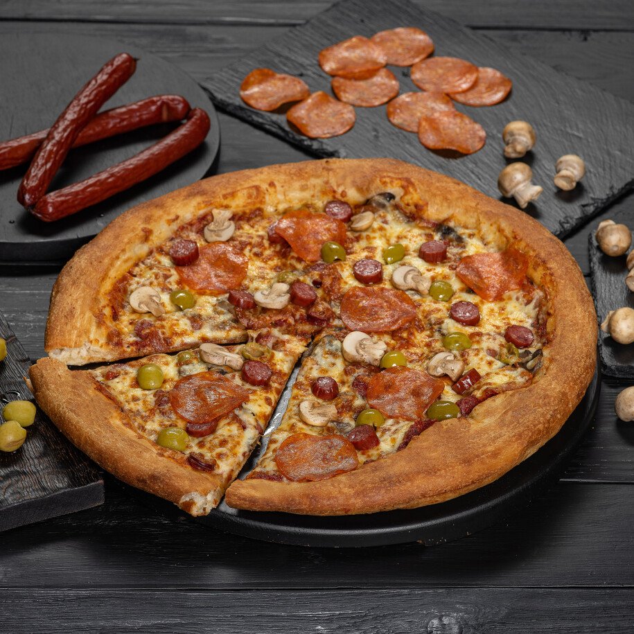 тесто дрожжевое, охотничьи колбаски, сыр моцарелла, колбаса полукопчёная, шампиньоны, соус красный фирменный, оливки, лук репчатый
