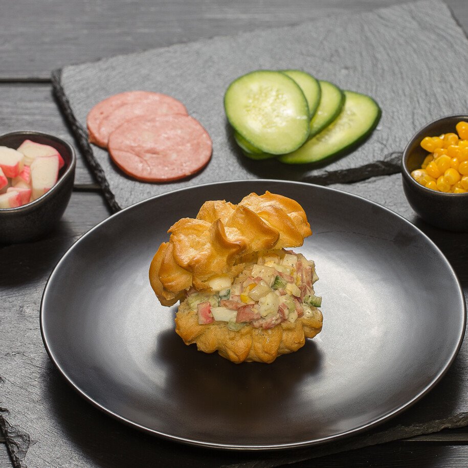 Булочка из заварного теста с начинкой из свежих огурцов, кукурузы, крабовых палочек, яйца и колбасы