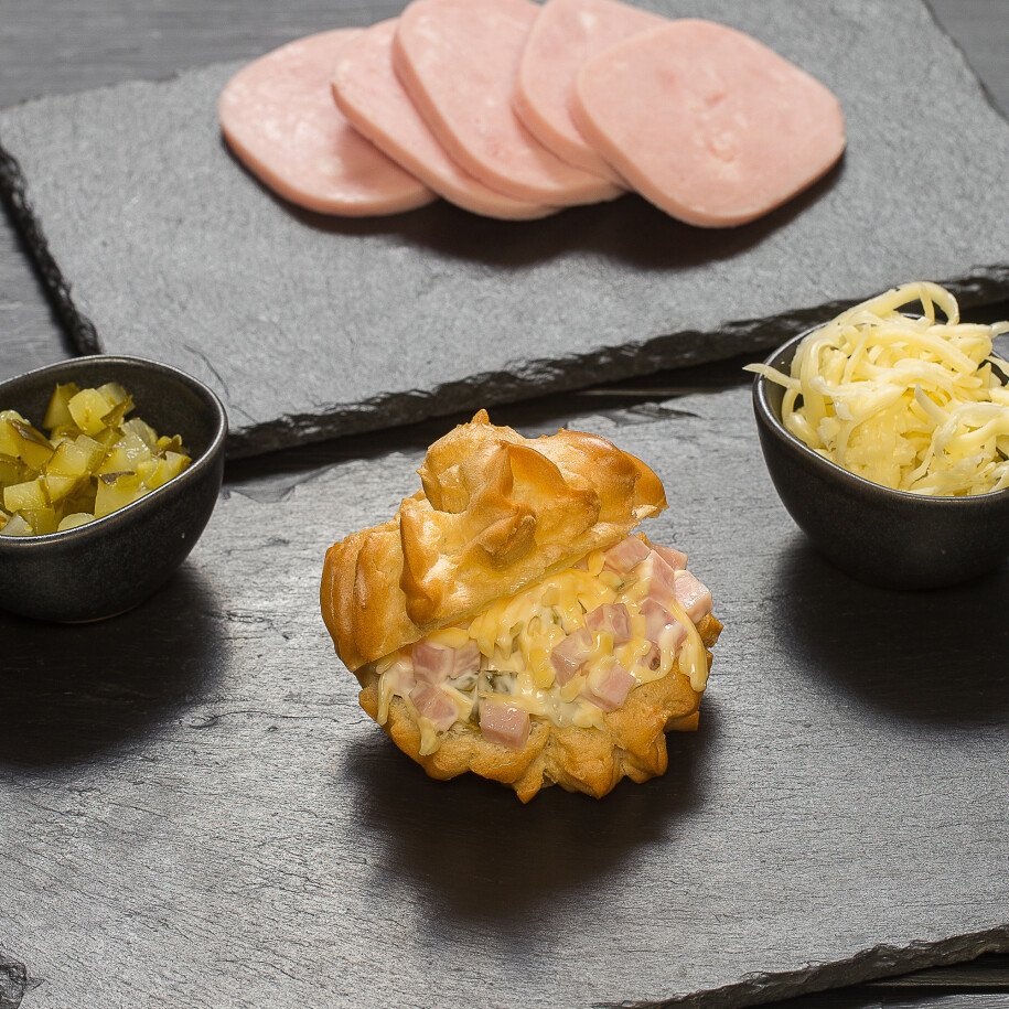 Булочка из заварного теста с начинкой из ветчины, сыра и консервированных огурчиков