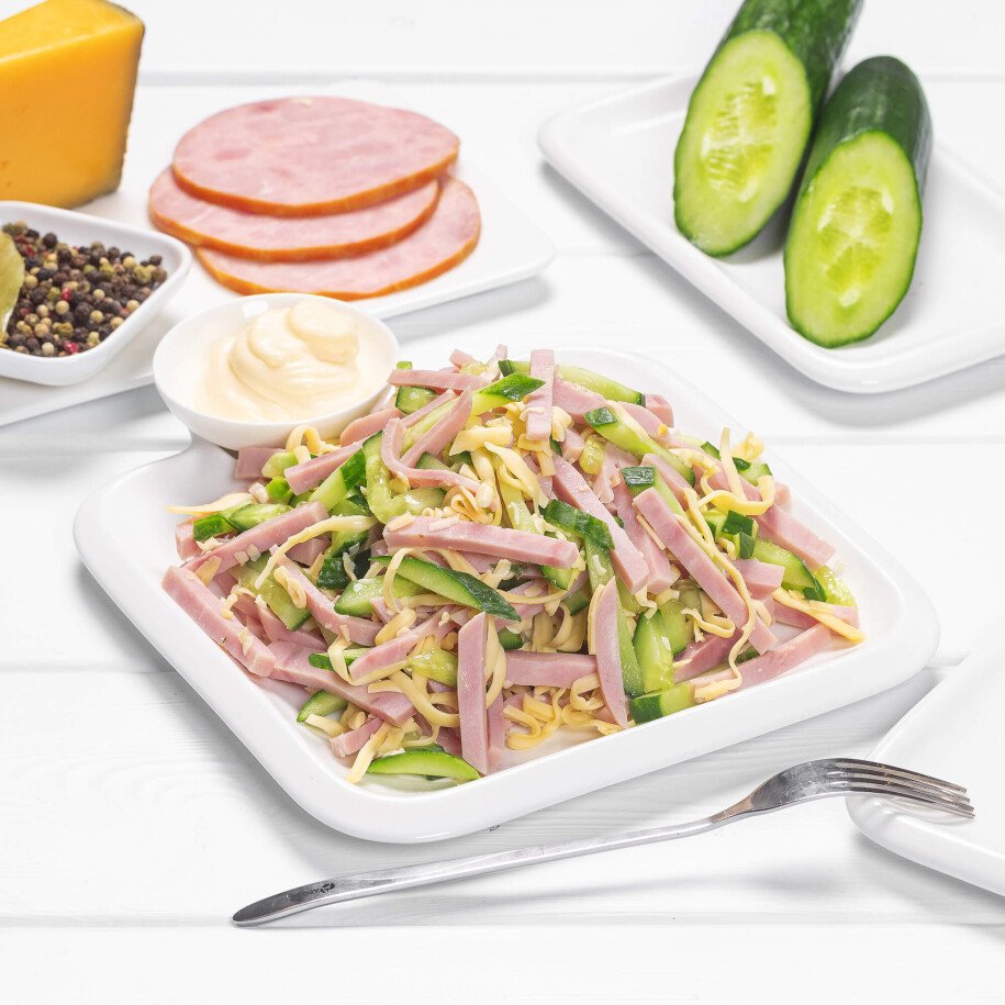 огурец свежий, ветчина, сыр твердый, майонез, соль