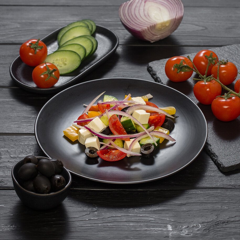 помидоры черри, огурцы свежие, сыр мягкий, перец болгарский, маслины без косточки, лук красный