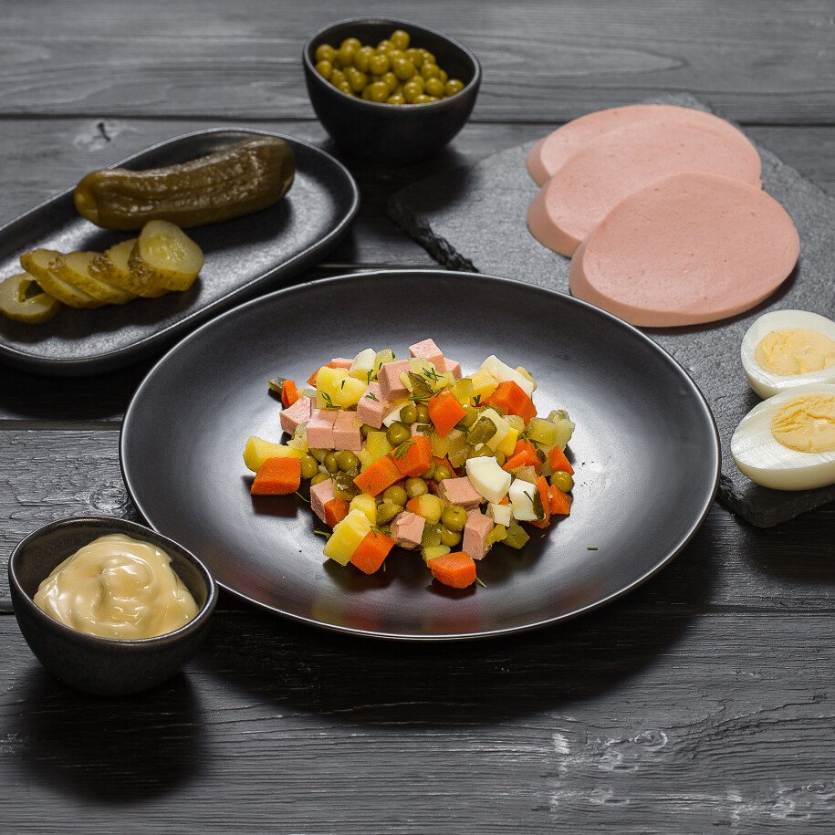 Традиционный салат с колбасой, овощами и яйцом под майонезной заправкой