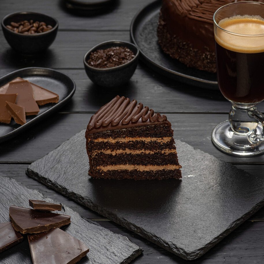 бисквит шоколадный (яйцо, сахар, мука в/с х/п, сметана 20%, масло сливочное, какао порошок, сода пищ., разрыхлитель); крем (масло сливочное, молоко сгущен., яйцо, какао порошок, ванилин); конфитюр абрикосовый, глазурь шоколадная (сливки 38%, шоколад темный) Хранить при температуре 4±2°С ЕАС