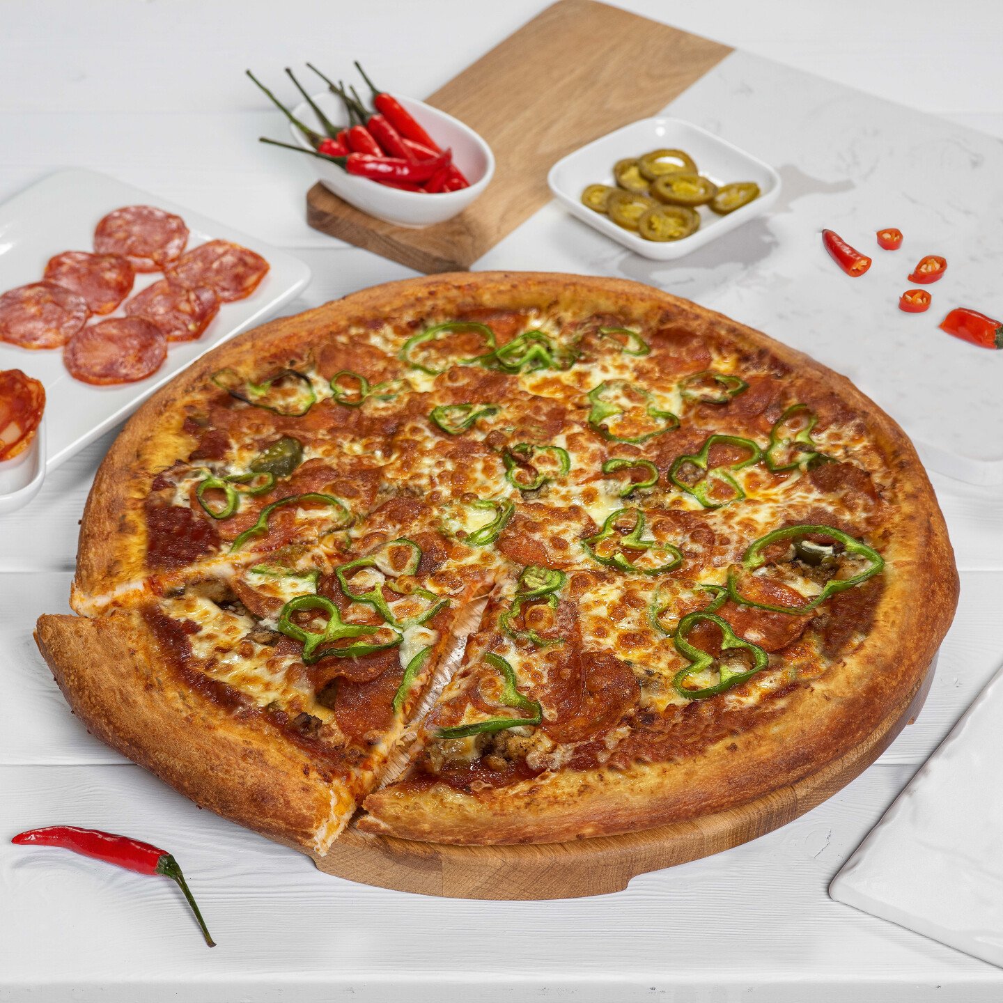Пицца «Бруклин» — это идеальное блюдо для любителей острых ощущений. Сочный мясной фарш, обжаренный с луком, сочетается с пикантной колбасой пеперони, соусом барбекю, острым зелёным перцем и перчиком халапеньо. Откройте для себя новые грани вкуса!