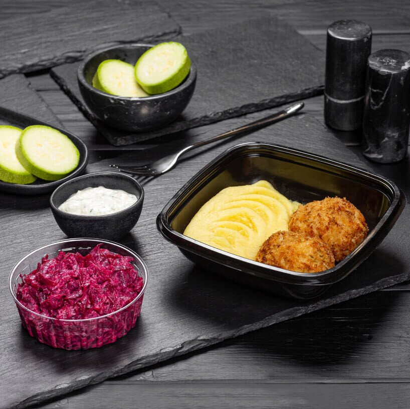 Куриные котлеты «Нежность» с картофельным пюре и закуской из свёклы