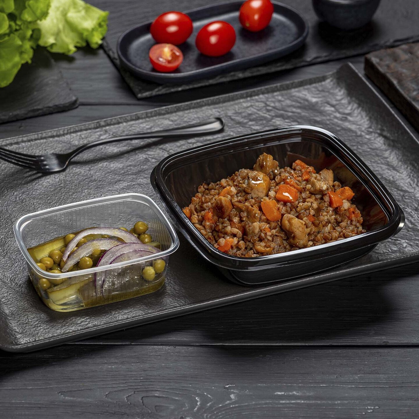 гречка, куриное бедро (филе), морковь свежая, масло растительное, лук репчатый, паста томатная, чеснок, соль, специи; закуска из консервированных огурцов (огурцы консервированные, зелёный горошек, лук красный свежий, масло растительное)