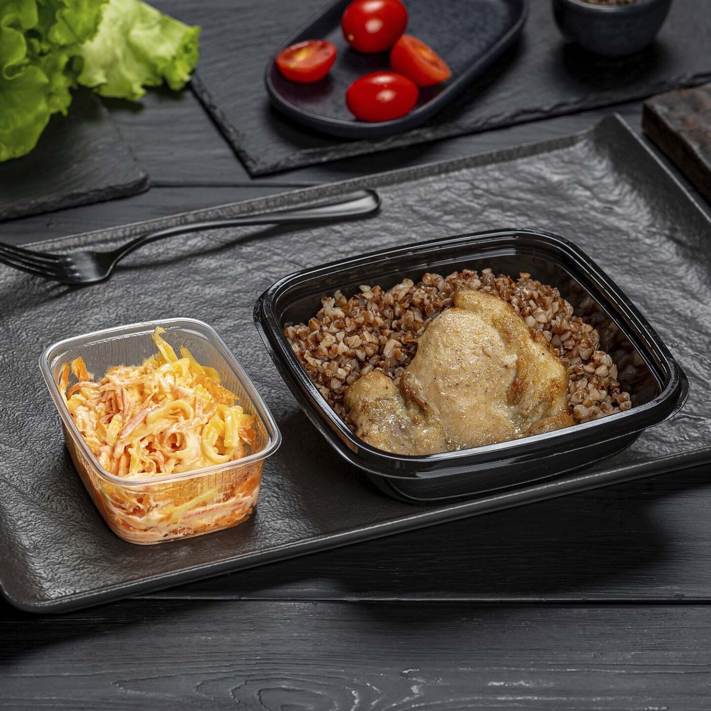 гречка отварная (грека, масло растительное, соль); куриное бедро запеченное (бедро куриное филе с/м, майонез, соевый соус, чеснок, лук репчатый, имбирь, перец чёрный молотый), закуска из моркови с сыром (морковь свежая, майонез, сыр, чеснок)
