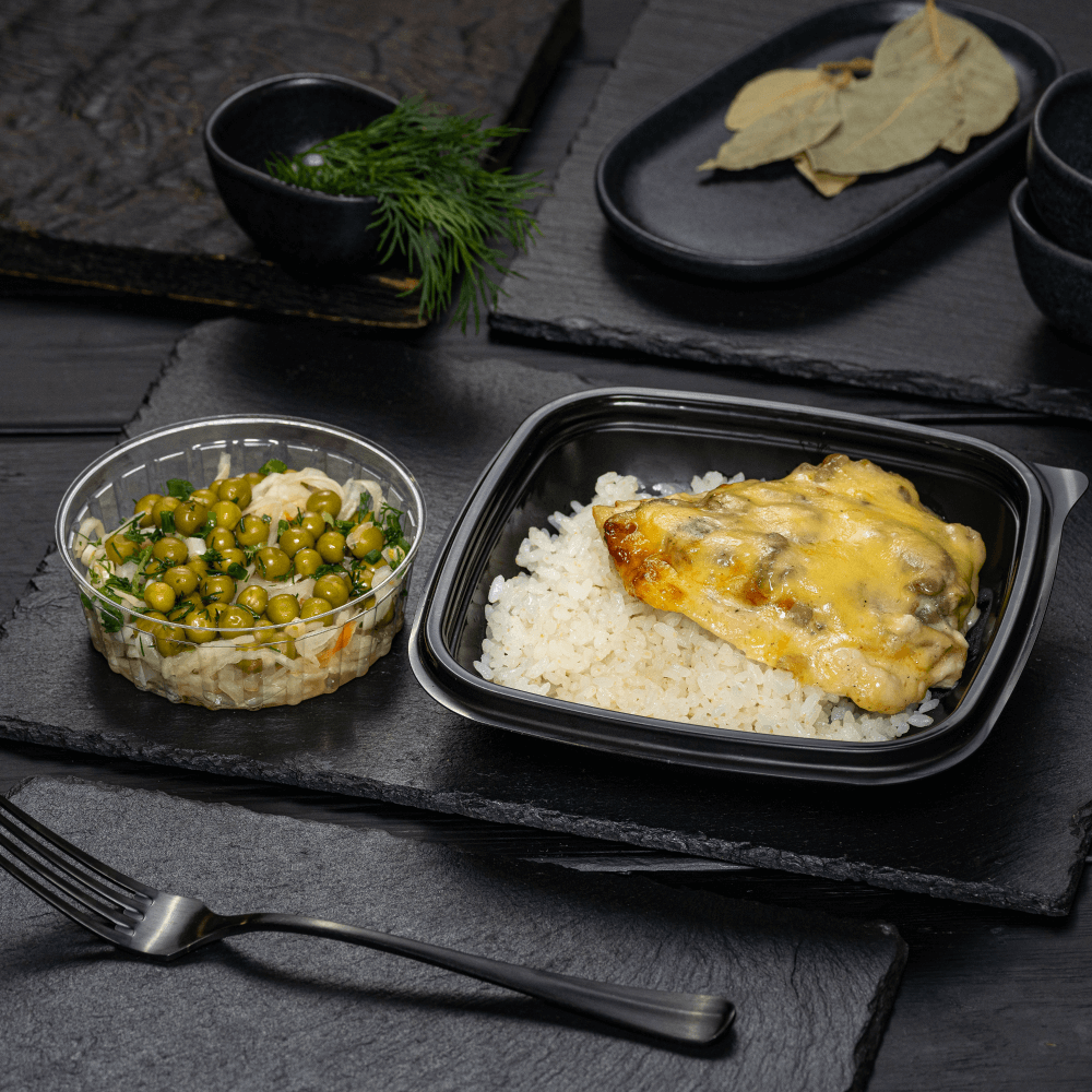 Нежное куриное филе, запеченное под шапочкой из грибов и сыра, с гарниром из отварного риса и салатной закуской из из хрустящей квашеной капусты, зеленого горошка и зелени