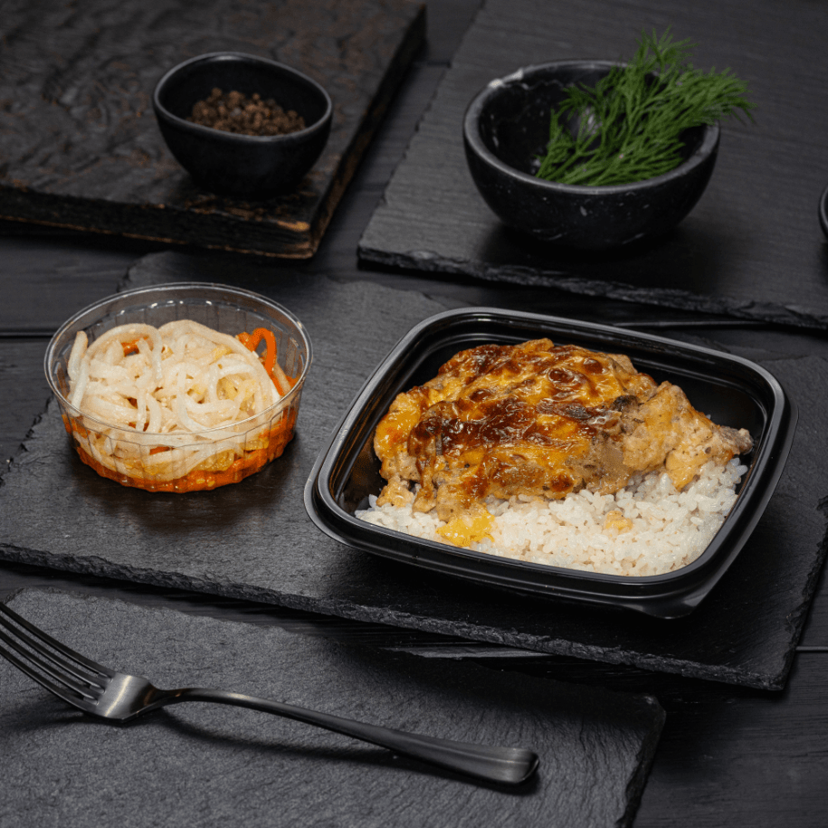 Нежное рыбное филе, запечённое под шапочкой из сыра и грибов в сливочном соусе, с гарниром из отварного риса и салатной закуской из свежего дайкона и морковки, приправленной ароматным чесночком.