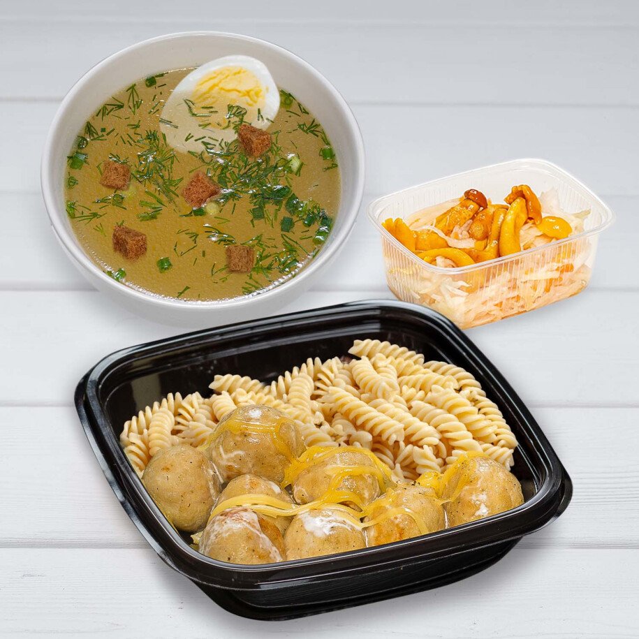 бульон (вода, бедро кур., морковь свежая, лук репчатый, соль), лук зеленый свеж., укроп свеж., сухарики (хлеб подольский), яйцо отварное (куриное яйцо), Куриные тефтели: филе курицы измельчен., лук репчатый, сухари пшеничные, молоко сухое, соль, специи, соус сливочный: сливки, сыр; макароны отварные: макароны, масло растительное, соль; закуска из маринованной капусты с опятами: капуста маринованная, опята маринованные, масло растительное