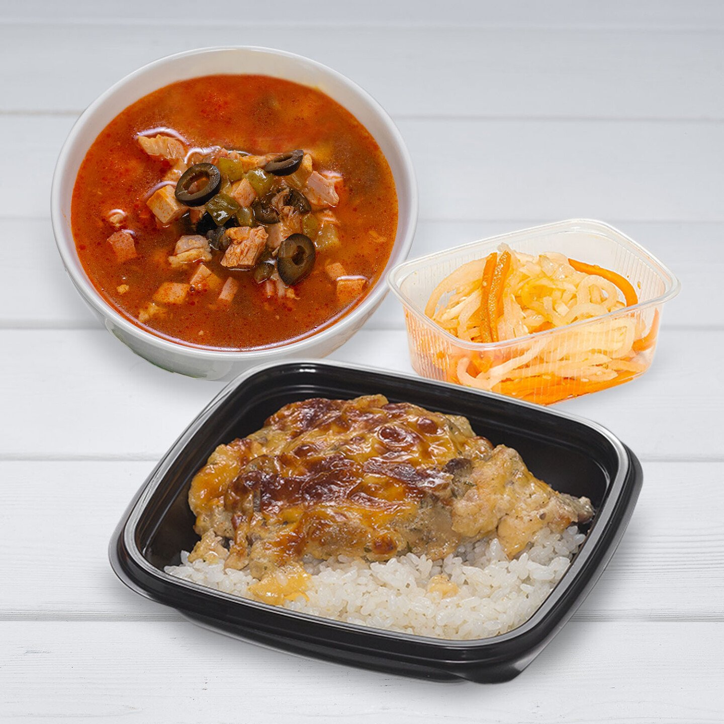 бульон куриный (бедро кур., морковь свежая, лук репчатый), мясо птицы отварное, огурцы консервирован., ветчина, колбаса молочная, колбаса п/к, маслины б/к, лук репчатый, томатная паста, масло растительное; рыба запечённая с грибами (минтай филе с/м, начинка грибная в сливочном соусе (шампиньоны с/м, лук репчатый свеж., соус «Бешамель"(молоко, масло сливочное, мука в/с, соль, специи), сыр, соль, перец черный молотый; рис отварной (крупа рисовая масло растительное, соль) закуска из дайкона (дайкон свежий, морковь свежая, масло растительное, чеснок св., уксус 9%, соль, сахар, глутамат, кориандр)