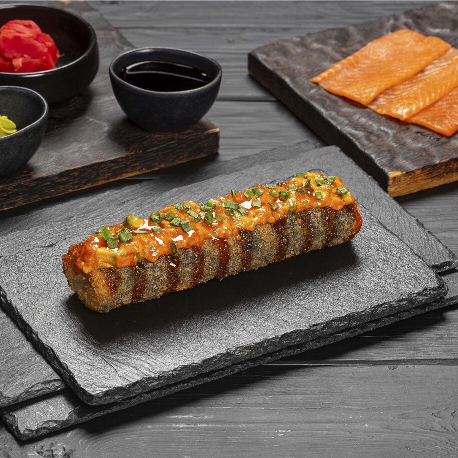 рис отварной, лосось филе, сыр сливочный, яйцо, сухари панировочные, огурец свежий, авокадо свежий, соус чили сладкий, соус спайс, мука темпурная, мицукан, соевый соус, имбирь маринованный, васаби