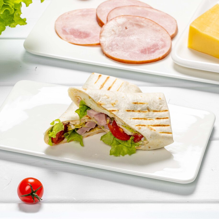 Классическое сочетание ветчины и сыра с добавлением помидорок черри и листового салата, в ароматной пшеничной лепешке с оригинальным соусом ранч